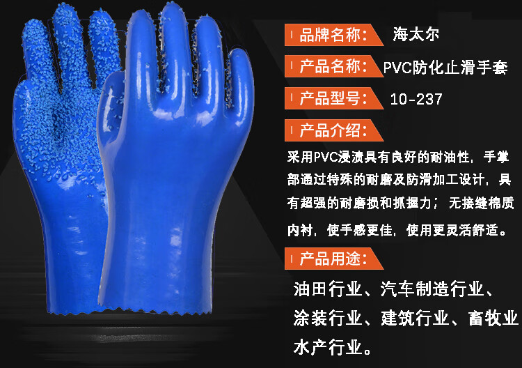 海太尔(HTR)10-237 PVC防化止滑手套防油耐磨手套26厘米棉质内衬舒适手套 蓝