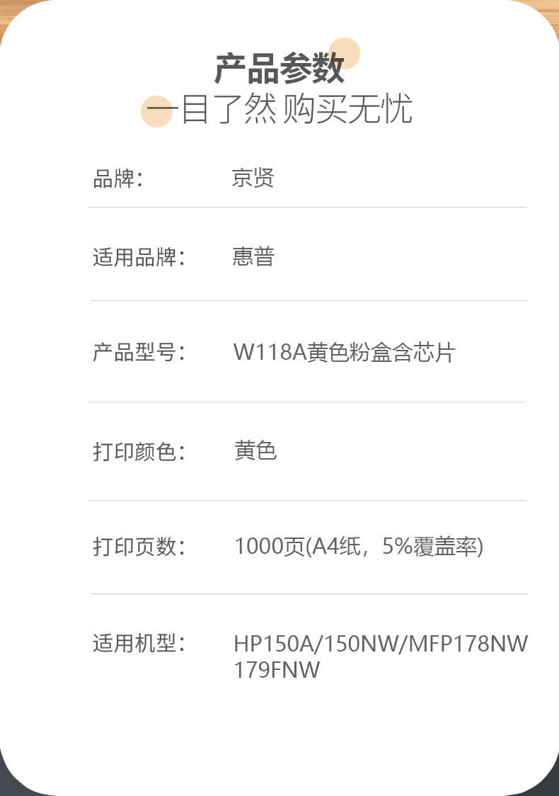 京贤W118A标准装黄色粉盒含芯片适用HP150A/150NW/MFP178NW/179FNW 单位:支