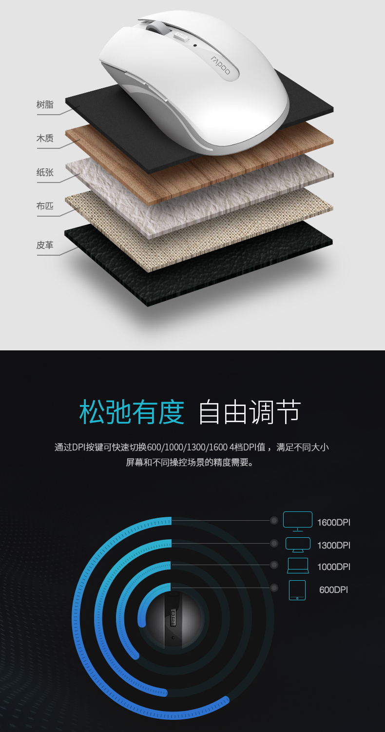 雷柏(Rapoo) 7200M 无线蓝牙鼠标 办公鼠标 轻音鼠标 便携鼠标 人体工程学 笔记本鼠标 电脑鼠标 白色 单位:个