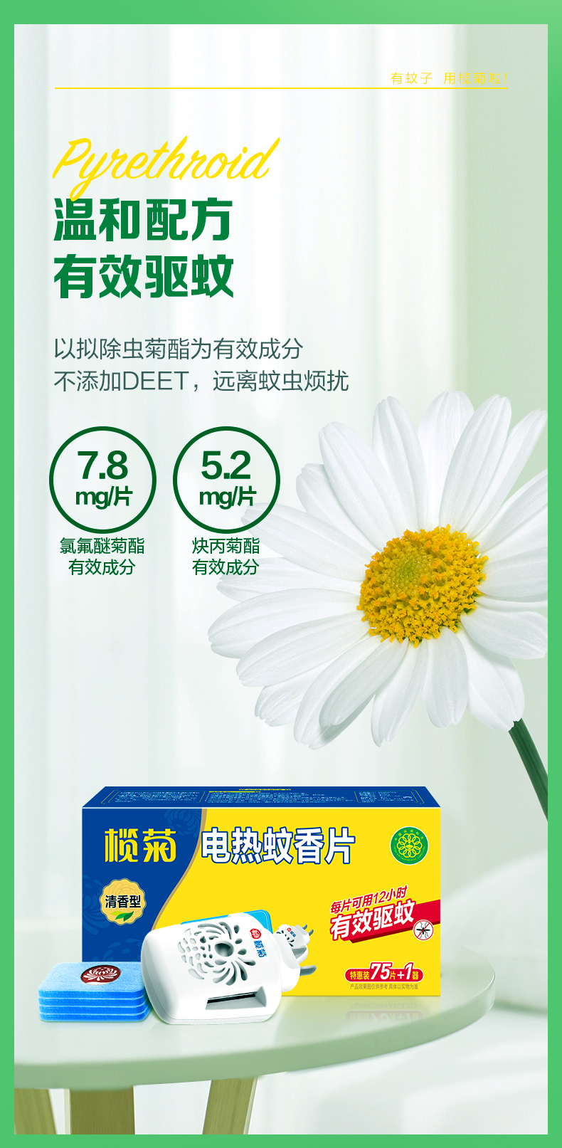 榄菊电蚊香片75片+1热器 清香型家用儿童孕妇用驱蚊灭蚊片防蚊电蚊片 单位:盒