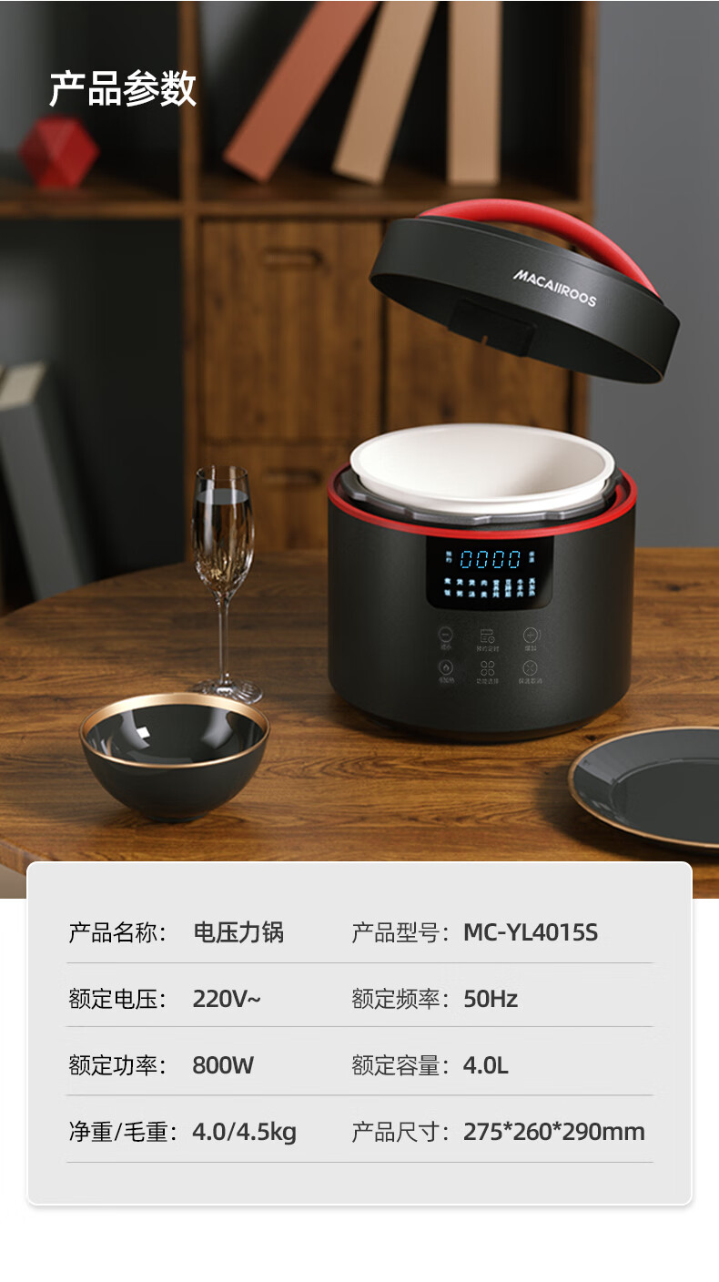 迈卡罗 (MACAIIROOS)电压力锅4L高压锅家用多功能电饭锅大容量电饭煲可预约汤锅 一键排压 MC-YL4015S 单位:个