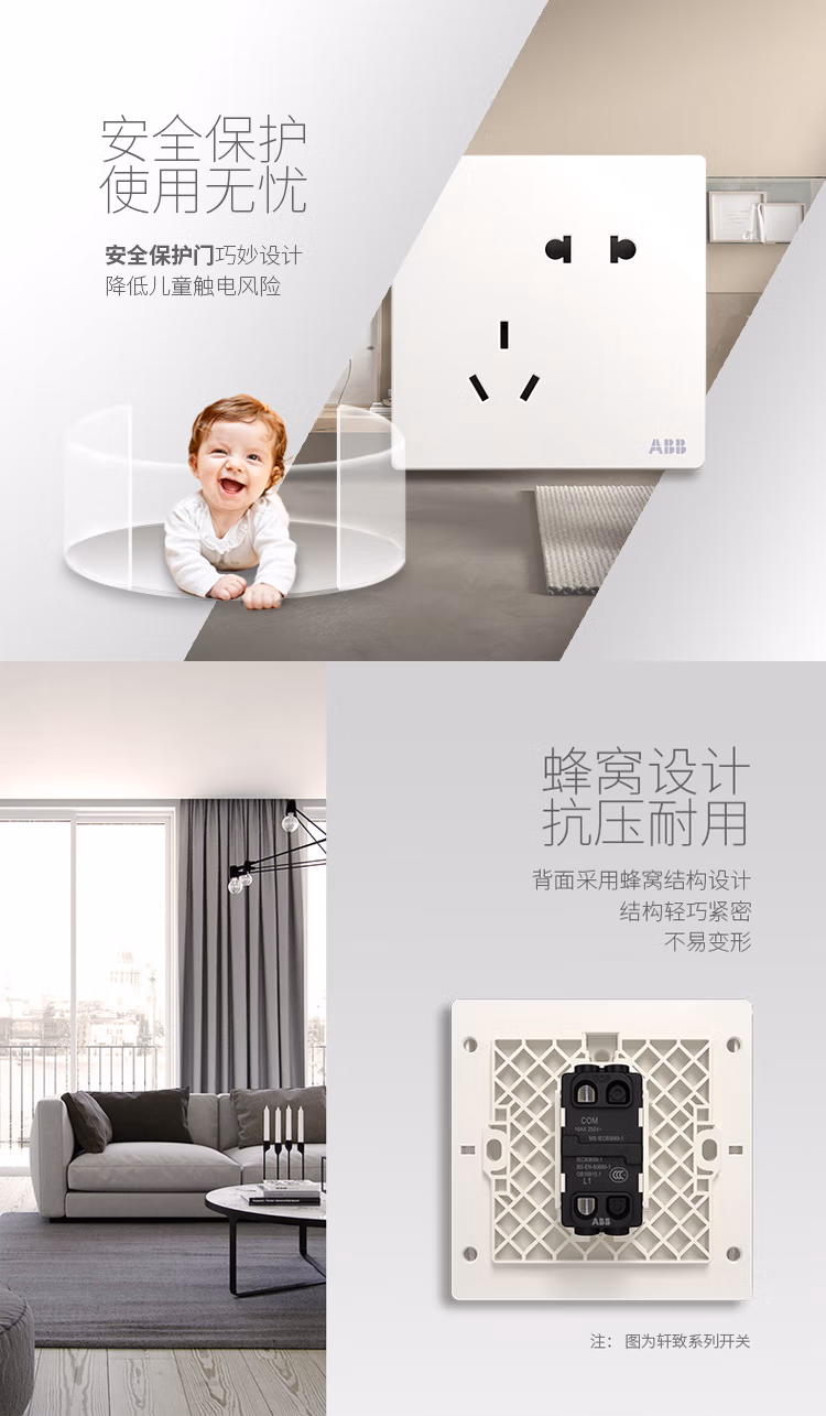 ABB墙壁插座 10A斜五孔插座八只装 轩致系列 白色 AF205*8 单位:个
